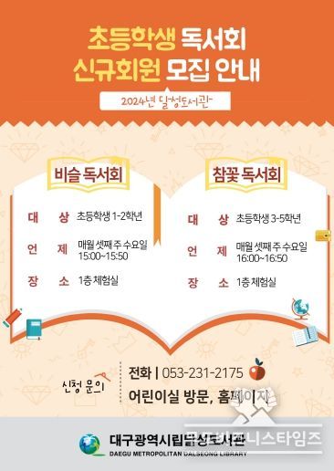 무도비지니스타임즈 최윤진 기자 | 대구달성도서관은 오는 2월부터 12월까지 초등학생 1~5학년을 대상으로 창의력과 논리력 증진, 독서흥미 고취를 위한 '어린이 독서회(비슬, 참꽃)'를 운영한다고 밝혔다.