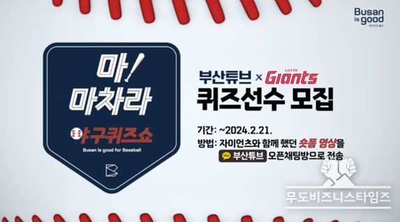 무도비지니스타임즈 최윤진 기자 | 부산시는 올해 프로야구 개막을 기념해 부산 연고 프로야구구단인 롯데자인언츠와 '마! 마차라, 부산튜브배 야구퀴즈쇼' 프로그램을 선보인다고 밝혔다.