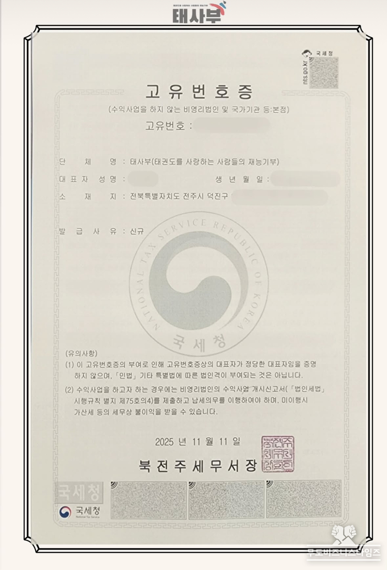 태사부는 태권도를 사랑하는 지도자와 수련생, 그리고 각 분야 전문가들이 뜻을 모아 만든 순수 비영리 단체로, 태권도를 통해 사회에 긍정적인 에너지를 전파하고자 하는 마음에서 출발했다. 최근 국세청으로부터 비영리 단체 고유번호증을 공식 발급받으며, 투명하고 체계적인 운영의 기틀을 마련했다.