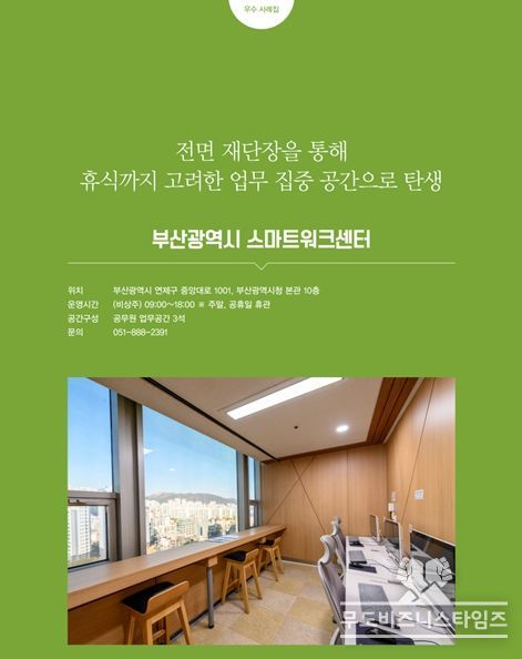 이번 수상에는 시가 지난 7월 낡고 열악했던 스마트워크센터를 전면 재단장해 휴식까지 고려한 업무 집중 공간으로 재탄생시켜 이용자들의 만족도를 높인 점이 주효했다.