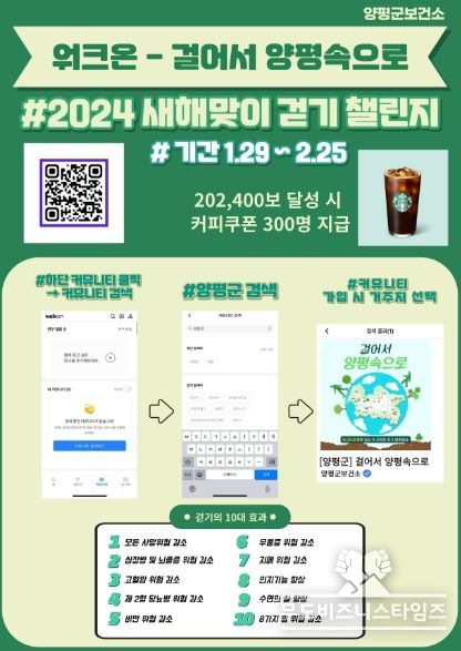 1월 29일부터 2월 25일까지 진행되는 이번 새해맞이 걷기 챌린지는 202,400보를 달성할 경우(1일 10,000보 제한) 선착순 300명에게 모바일 커피 쿠폰을 제공한다.