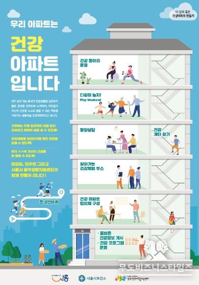 건강 아파트 만들기 프로그램은 ▲플레이스타터와 함께하는 집 앞 놀이터 ▲동네 한바퀴 ▲계단 걷기 ▲파크 트레이너 ▲플로깅 챌린지 ▲찾아가는 건강홍보관 ▲행복운동교실(댄스 및 스트레칭) ▲올바른 약물 복용법 교육 ▲우울증 예방 교육으로 진행된다.