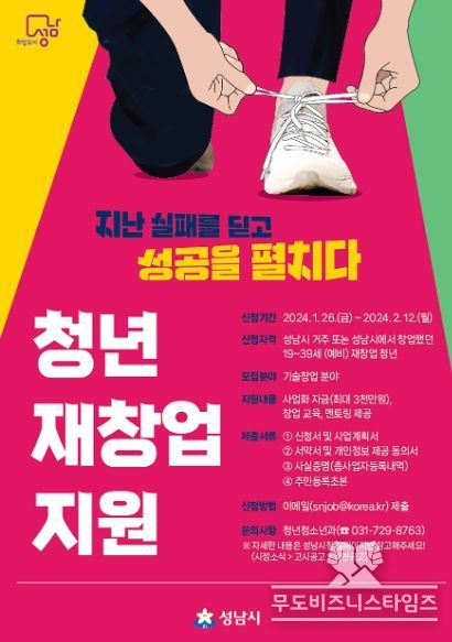 무도비지니스타임즈 최윤진 기자 | 성남시는 오는 2월 12일까지 ‘청년 재창업 지원사업’에 참여할 (예비)재창업자의 신청을 받는다.
