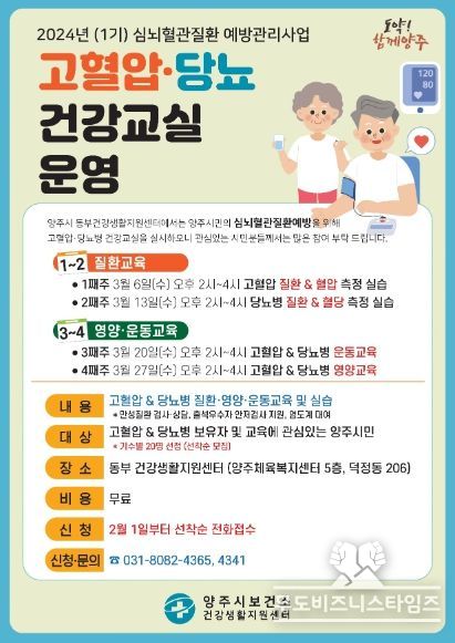 무도비지니스타임즈 최윤진 기자 | 양주시보건소 동부 건강생활지원센터에서는 양주시민의 심뇌혈관질환 예방을 위해 만성질환 보유자 및 교육에 관심 있는 시민을 대상으로 ‘고혈압·당뇨병 건강교실’대상자를 모집한다고 밝혔다.