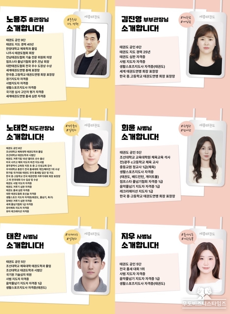 또한 노 총관장은 전남태권도협회 기술전문위원회 의장과 나주시태권도협회 회장을 역임하며 지역 태권도 발전을 선도하고 있다. 그의 지도 철학은 “기술보다 인성, 경쟁보다 성장”이라는 세종태권도의 핵심 가치와 맞닿아 있다.
