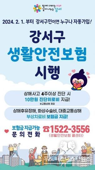무도비지니스타임즈 안휘랑 기자 | 서울 강서구가 일상생활 속 발생할 수 있는 예기치 못한 사고로부터 구민들을 보호하기 위해 2월부터 ‘강서구 생활안전보험’을 시행한다고 밝혔다.