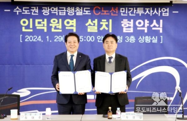 무도비지니스타임즈 최윤진 기자 | 안양시는 29일 15시 시청 상황실에서 민자사업시행사인 지티엑스씨(주)와 ‘수도권광역급행철도 C노선 인덕원역 설치 협약’을 체결했다.