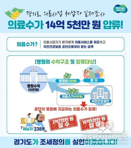 무도비지니스타임즈 최윤진 기자 | 경기도는 세금을 체납중인 병원, 약국, 요양원 등 의료사업자 238명으로부터 의료수가 14억5천만 원을 압류했다고 1일 밝혔다.
