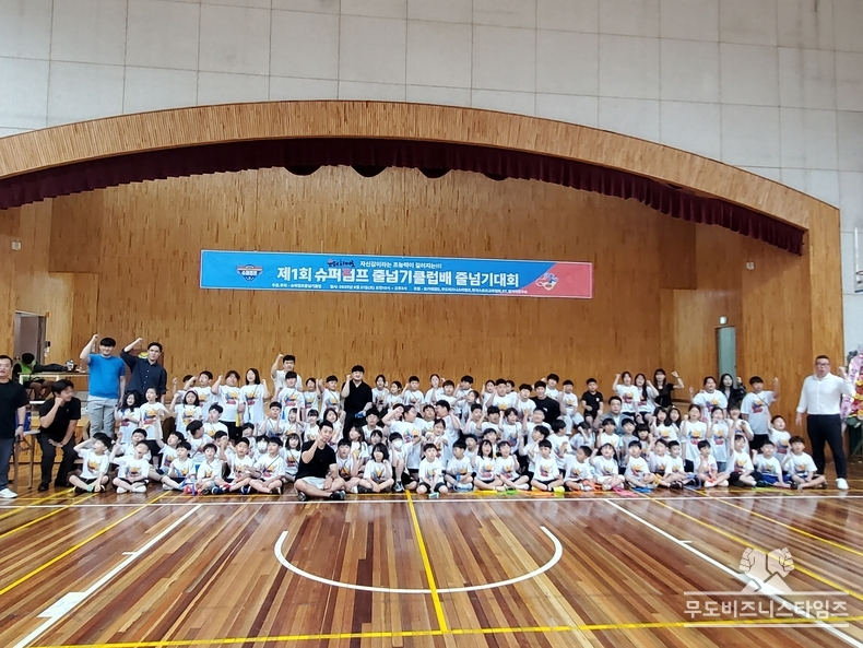 지난 1학기에 열린 제1회 슈퍼점프줄넘기클럽배 대회에서 아이들이 즐겁게 단체전 경기에 참여하는 모습.