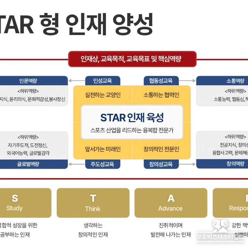 경희대학교 스포츠 DNA+학과는 Study(학문 탐구), Think(창의적 사고), Advance(진취적 발전), Responsibility(책임 있는 리더십)의 4대 핵심 키워드로 구성된 ‘STAR형 인재 양성 프로그램’을 운영한다.