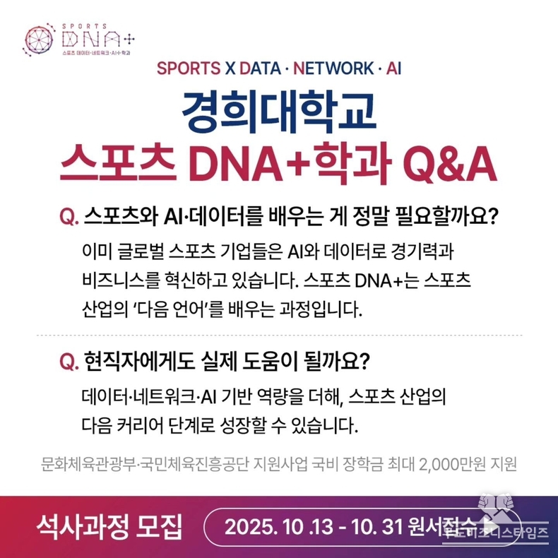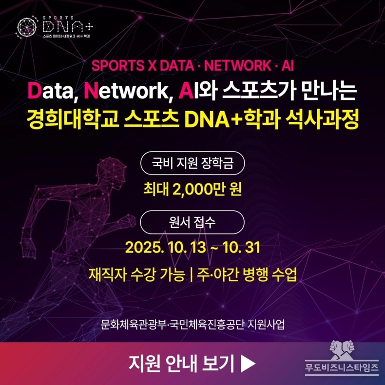 2023년도 국민체육진흥공단의 지원사업 공모에 선정된 경희대학교 체육대학원 ‘스포츠 DNA+학과'*가 오는 2025학년도 3기 석사과정 신입생을 모집한다.
