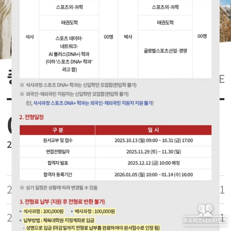 전형료는 석사과정 10만 원이며, 체육대학원 지정 계좌로 납부하면 원서 접수가 완료된다.